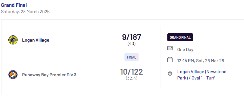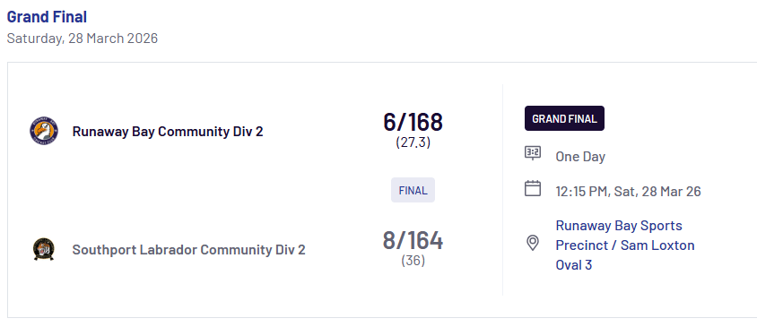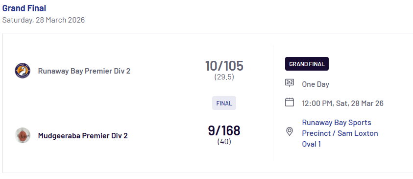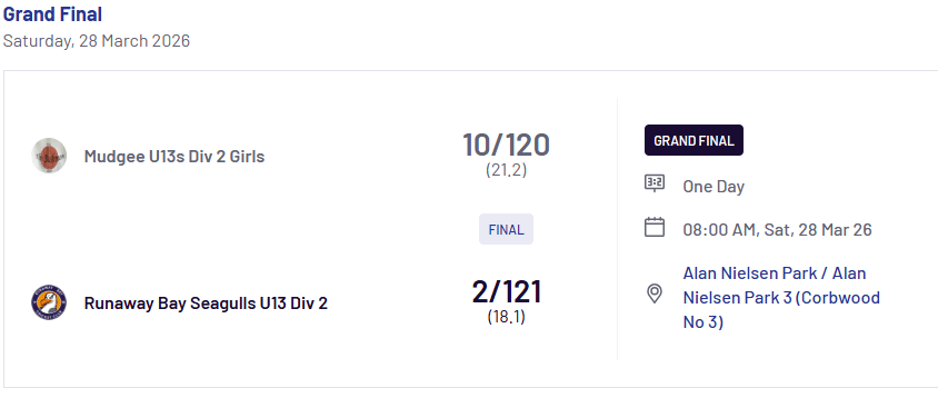 The Runaway Bay Seagulls have been crowned Grand Final Champions after a dominant 8-wicket victory over Mudgeeraba at Alan Nielsen Park.