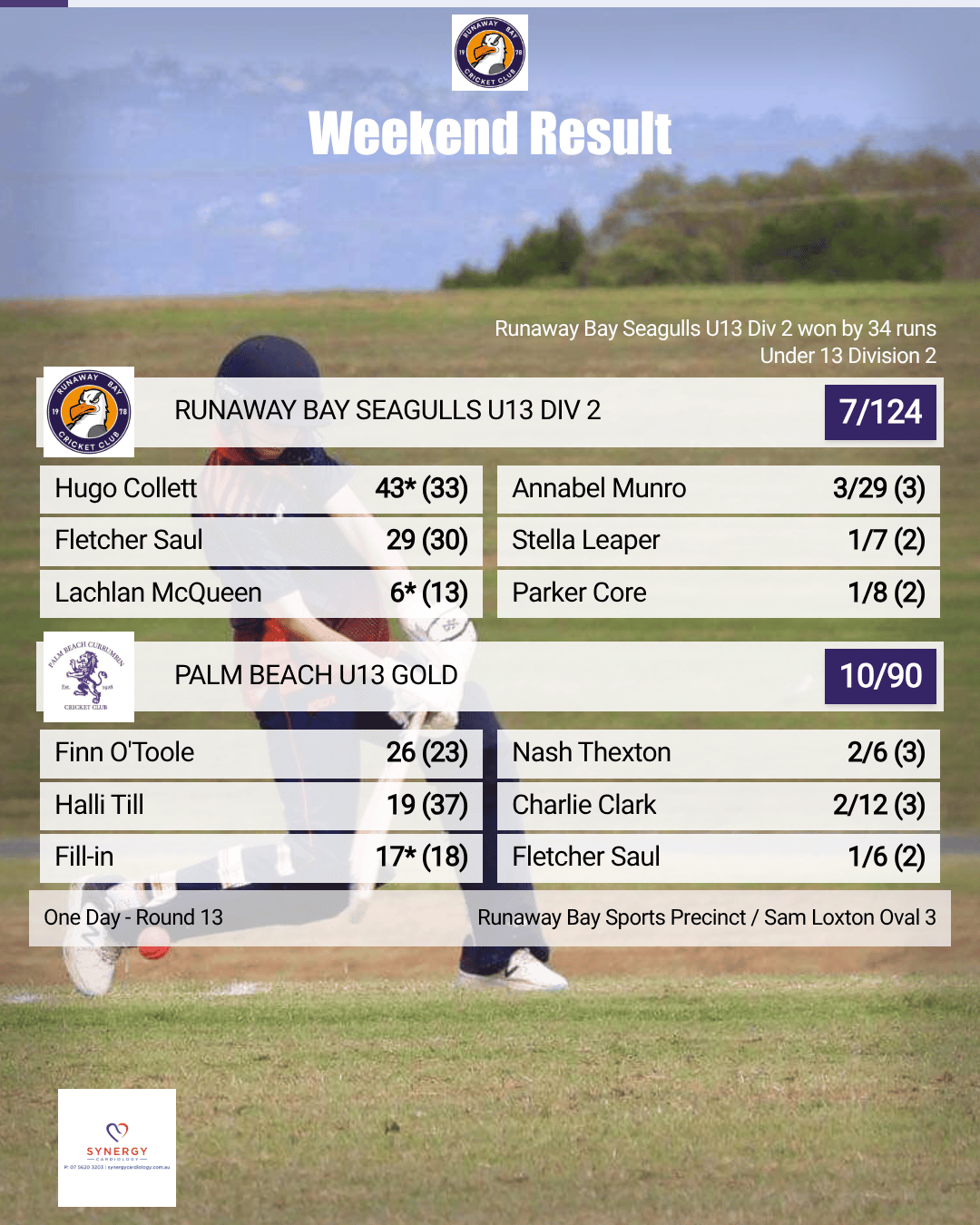 The Runaway Bay Seagulls secured a hard-fought victory against Palm Beach U13 Gold, winning by 34 runs in a competitive clash.