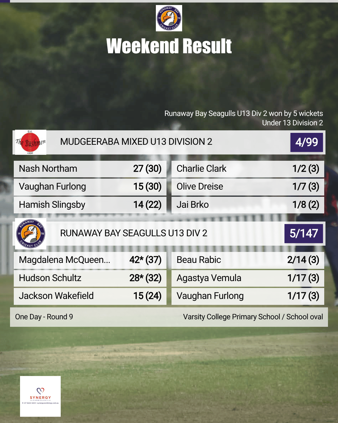 Well done to the Runaway Bay Seagulls U13 Div 2 team on a fantastic team victory!