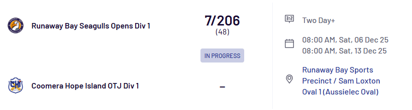 The Runaway Bay Seagulls Opens Div 1 put together a determined and spirited batting performance on Day 1 of their two-day clash with Coomera Hope Island, finishing with a very competitive 7/206 from 48 overs in what was a great display of patience, partnerships and late-innings lift!