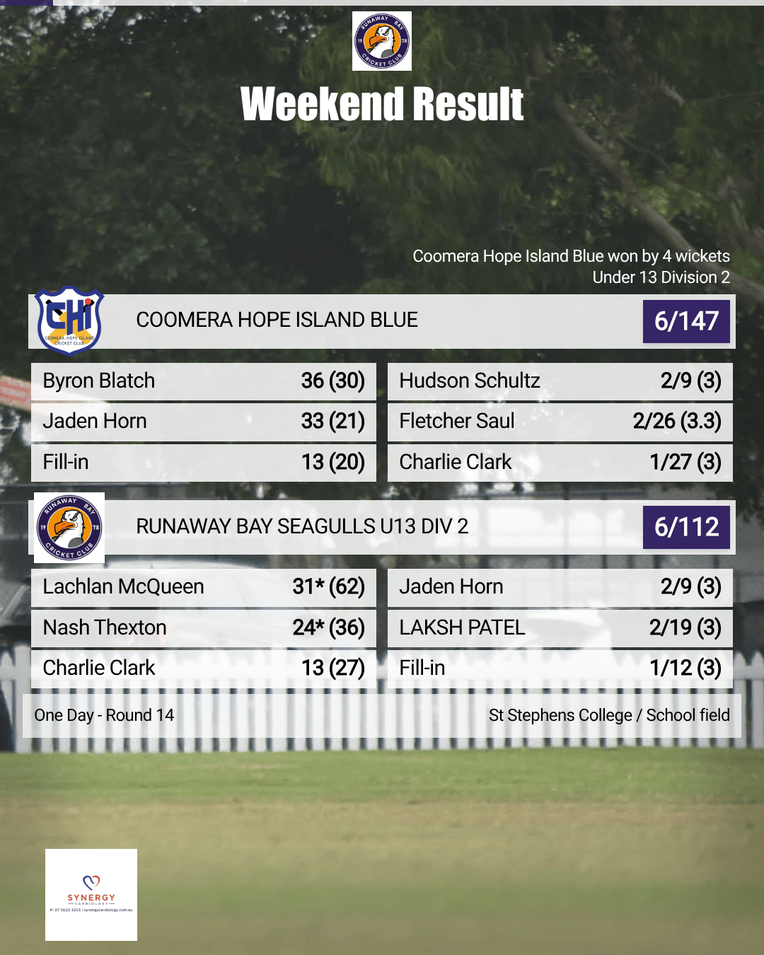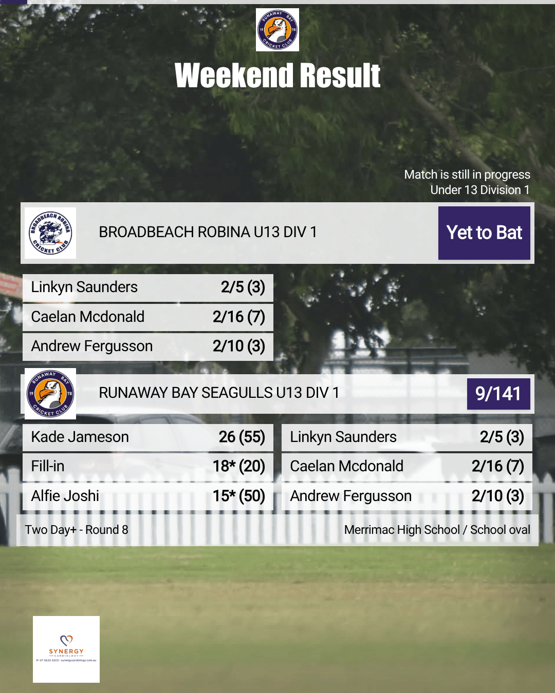 With 232 on the board, Runaway Bay will be looking to make early inroads with the ball next weekend and put Helensvale under pressure from the outset. The batting group has done its job — now attention turns to a disciplined bowling performance to take control of the match on Day 2.