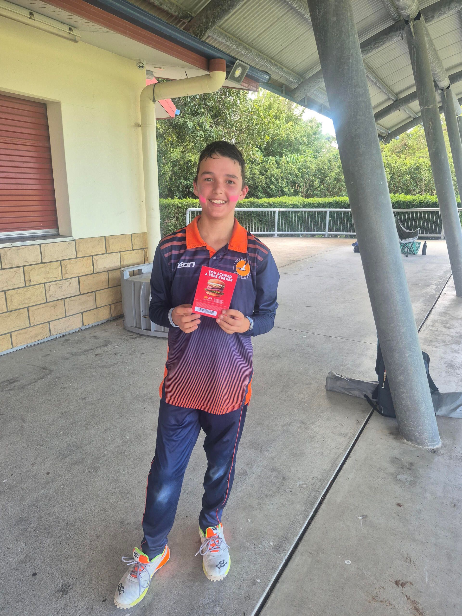 NIc won the The Runaway Bay Taverns $25 Voucher this week for filling in and fielding for the 4th Grade orange side. Well Done Nic!!