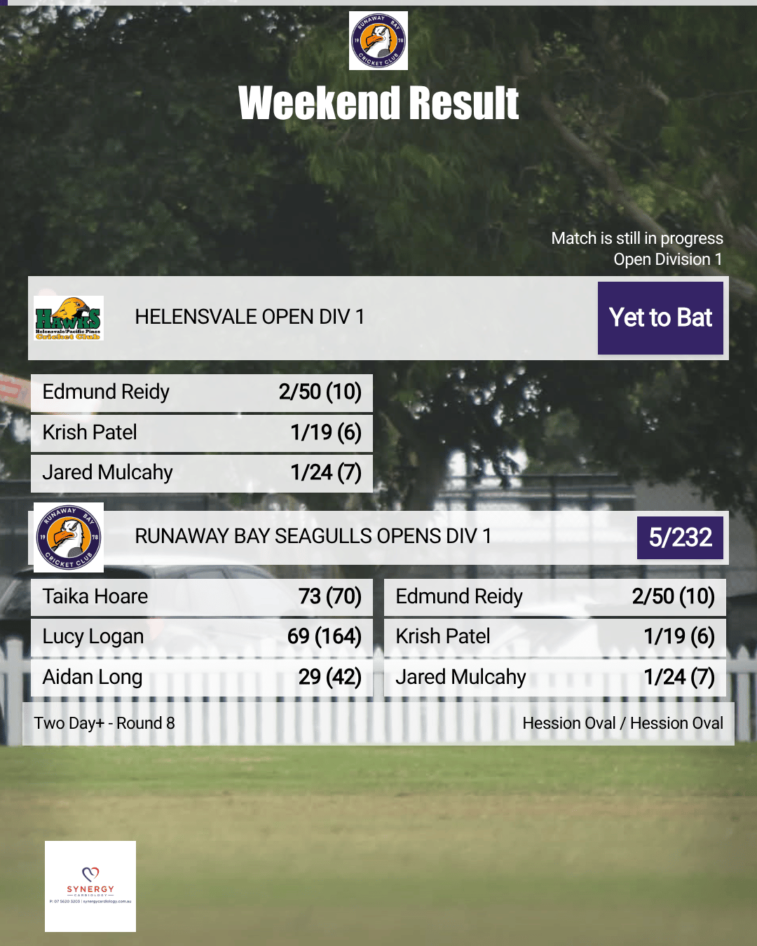 The Runaway Bay Seagulls Opens Div 1 side laid a solid foundation on Day 1 of their two-day fixture against Helensvale, posting 5/232 from 50 overs after winning the toss and electing to bat. With the ball to be taken next weekend, the Seagulls will head into the break confident they’ve put a competitive total on the board.