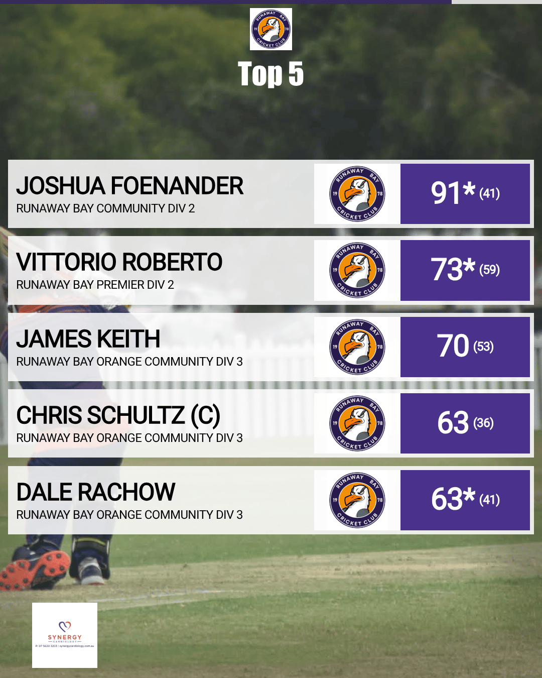 The innings reached another level late thanks to Dale Rachow, who finished with a superb unbeaten 63 from 41 balls. Rachow’s clean hitting and smart placement allowed Runaway Bay to surge past the 300 mark, with valuable support from Sam Brookes and Aidan Long as the total ballooned to an imposing 301.