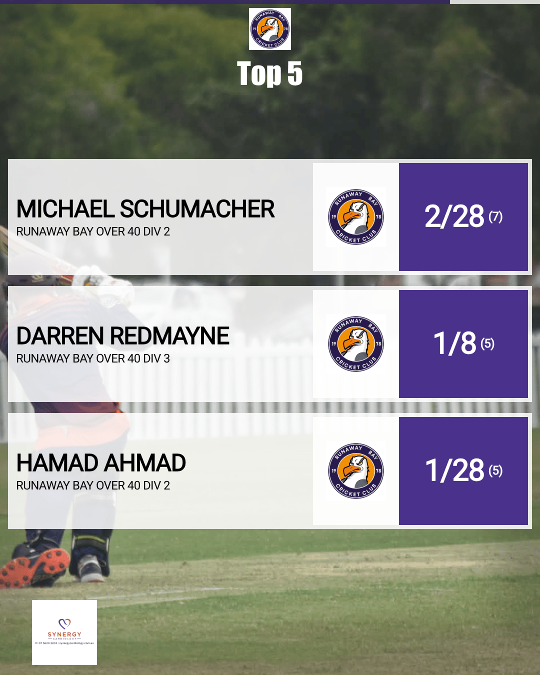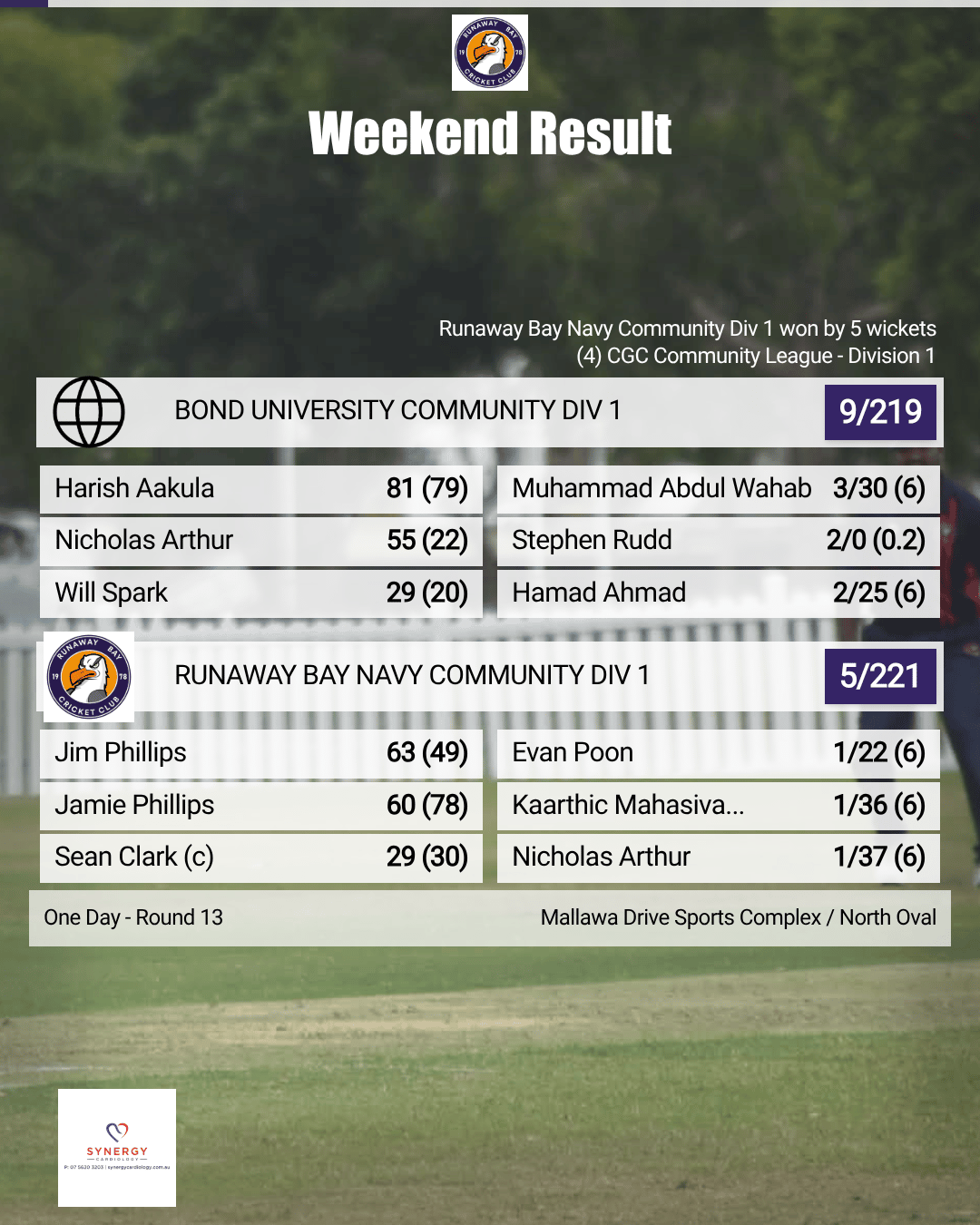 Runaway Bay’s innings was anchored by Murray Peirce with 26 and Jim Phillips with 22, before the side was bowled out for 100. In defence, Darren Redmayne impressed with a tight new-ball spell of 1/8 (5.0), supported by energetic work in the field despite an eventual eight-wicket defeat.